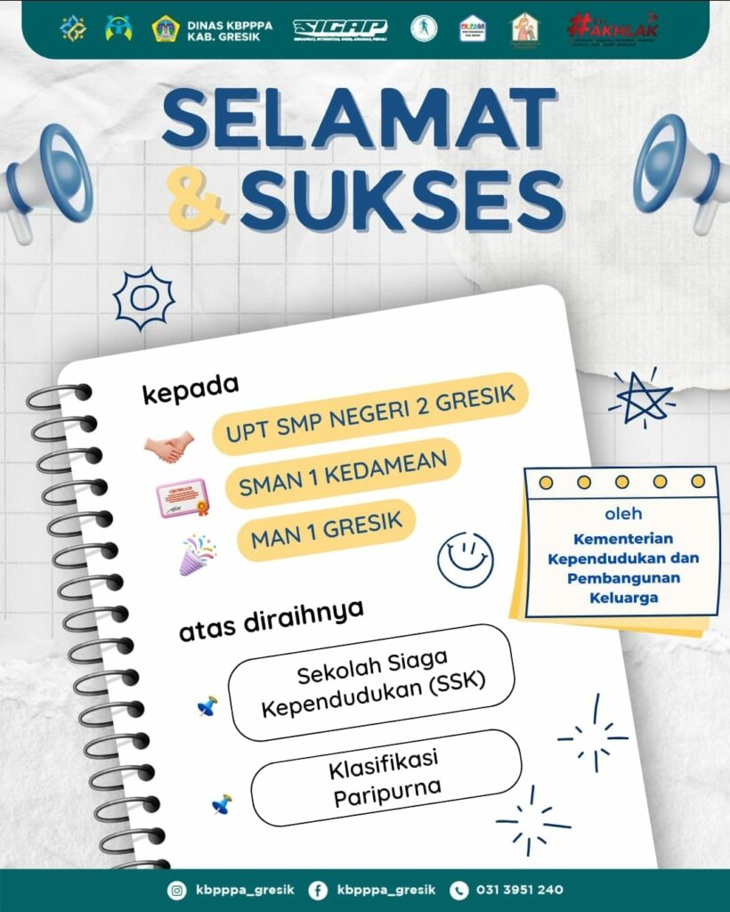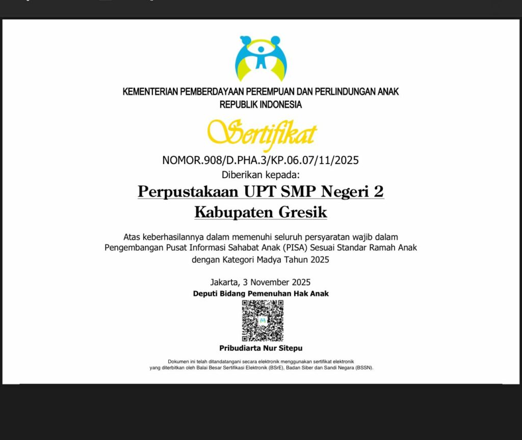 UPT SMP Negeri 2 Gresik kembali menorehkan prestasi membanggakan dengan menjadi SMP pertama di Kabupaten Gresik yang memperoleh penghargaan predikat Paripurna dalam evaluasi capaian Sekolah Siaga Kependudukan (SSK) dari Kementerian Kependudukan dan Pembangunan Keluarga/BKKBN. Penghargaan ini menjadi bukti komitmen sekolah dalam mengintegrasikan pendidikan kependudukan ke dalam kegiatan pembelajaran dan budaya sekolah.