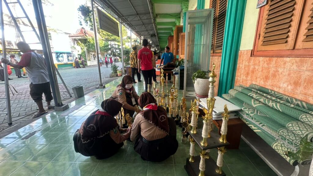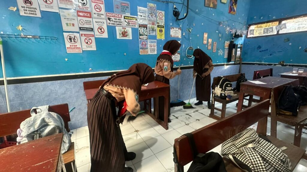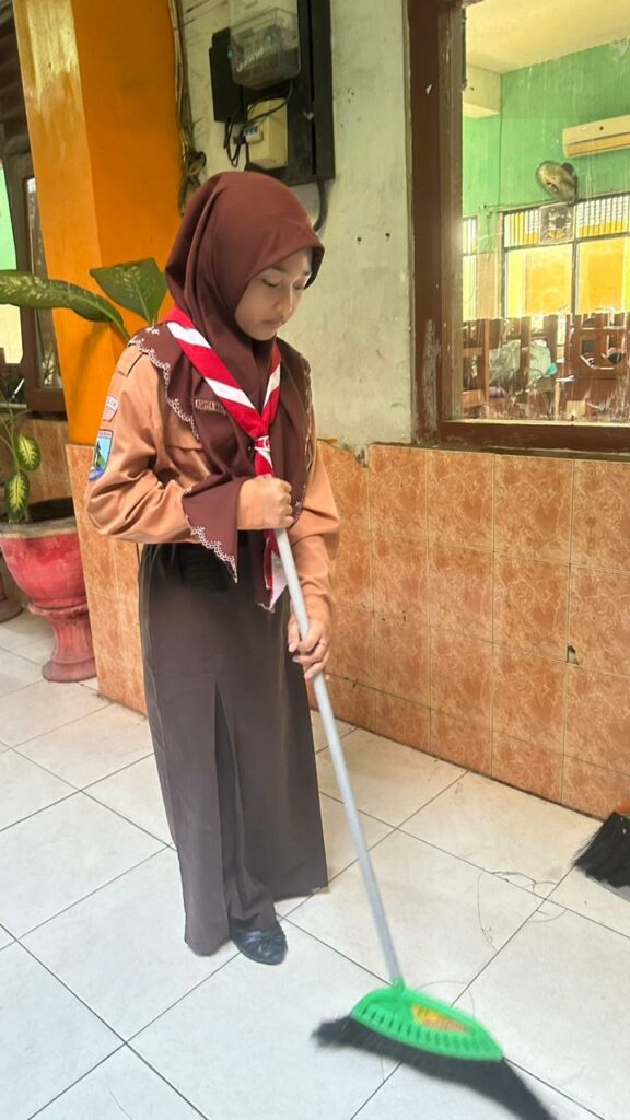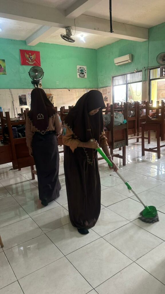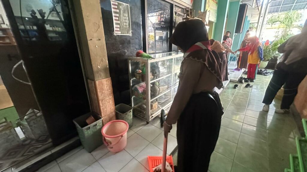 Sejak pagi hari, seluruh murid, bapak dan ibu guru, serta tenaga kependidikan bergotong royong melakukan kegiatan bersih-bersih di berbagai area sekolah. Pembersihan dilakukan di ruang kelas, perpustakaan, musala, ruang guru, teras sekolah, taman baca, hingga sudut baca SSK (Sekolah Siaga Kependudukan). Para wali kelas turut mendampingi murid-murid di kelas masing-masing agar kegiatan berjalan tertib dan maksimal.